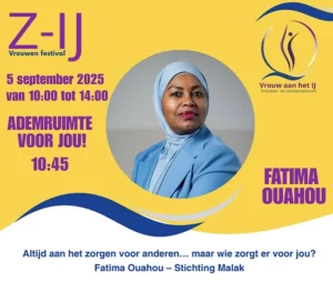 Tijdens het Z-IJ Vrouwenfestival op vrijdag 5 september 2025 geeft Fatima Ouahou de inspirerende workshop “Ademruimte voor jou”.